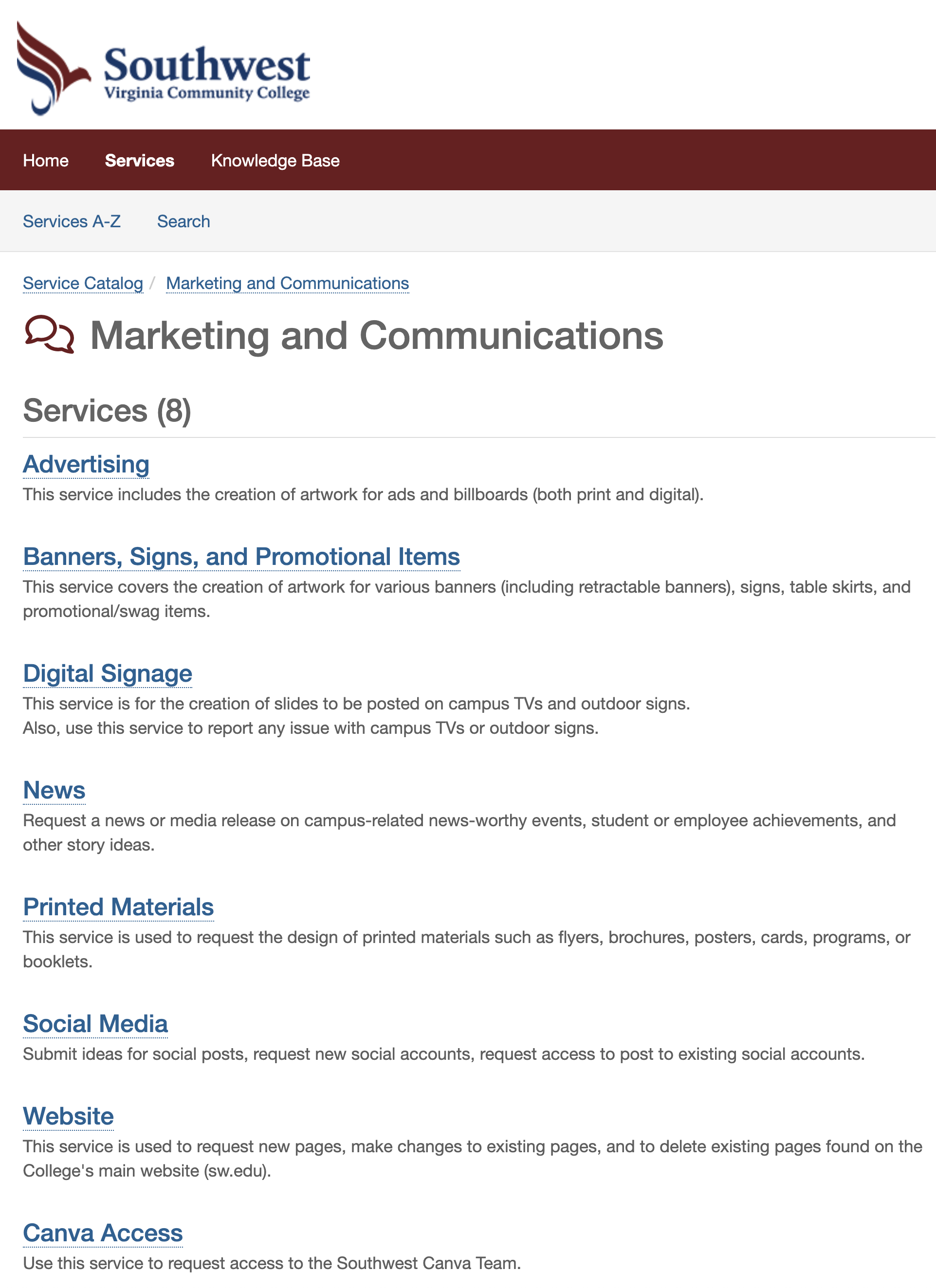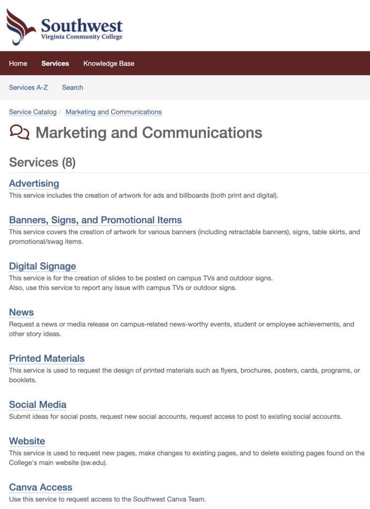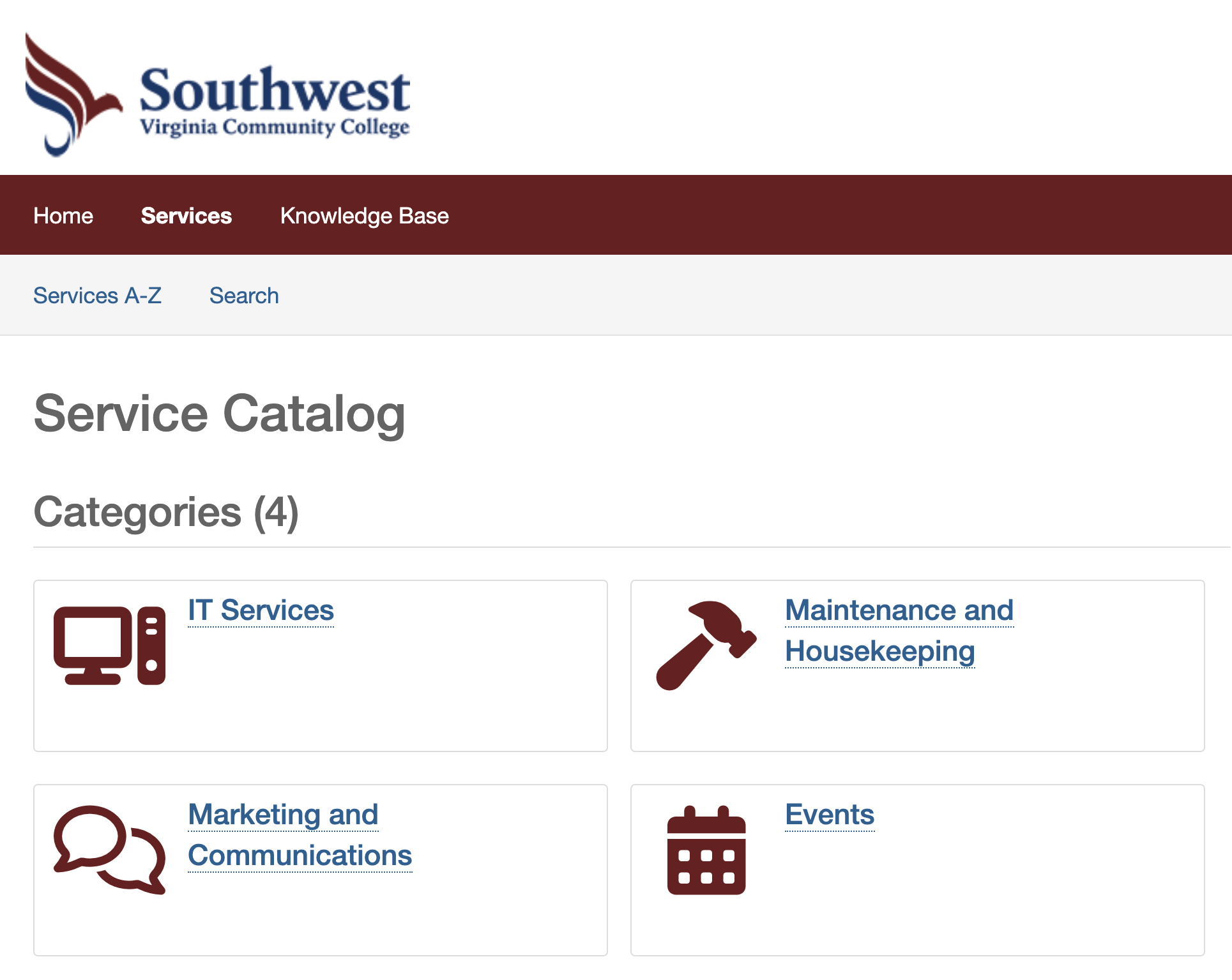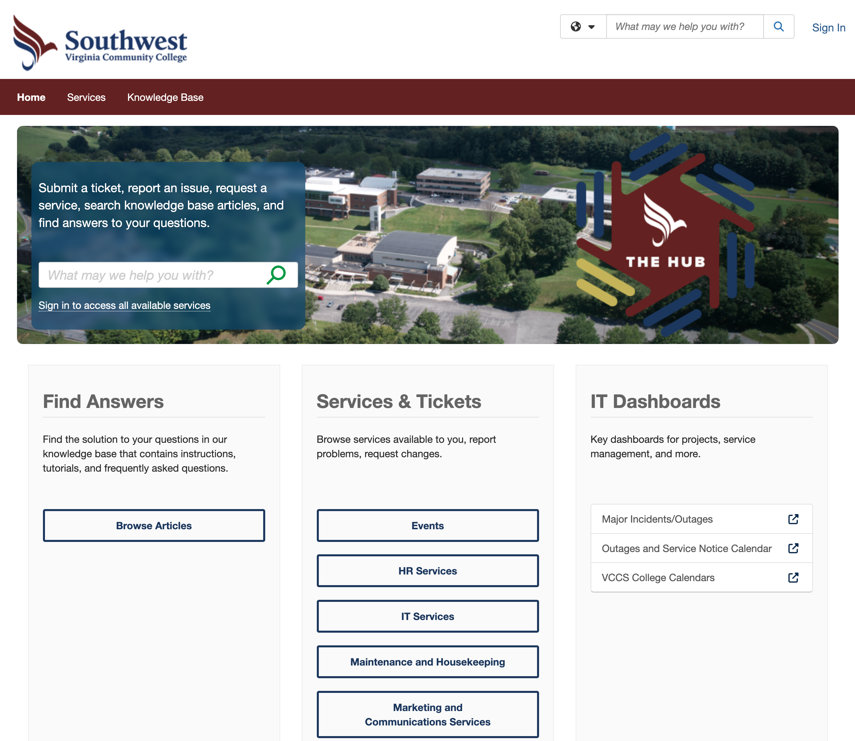 We are excited to announce The Hub, your one-stop portal to request campus services. The Hub will replace the request systems previously used by IT, Maintenance & Housekeeping, and Events – plus we will be adding Marketing & Communications, Human Resources, and other departments that provide services to campus. The main goal of The Hub is to have a single place to request services across campus.
