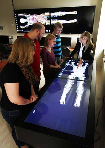 The Virtual Cadaver Lab simulation provides students a view into the human body from any angle. They can interact with the life-sized screen with a virtual probe, which even allows them to cut open the skin for exploration.